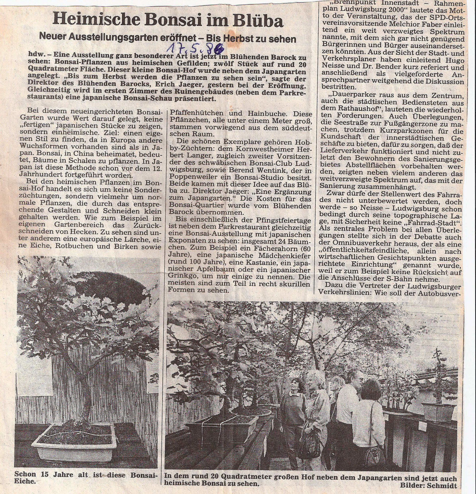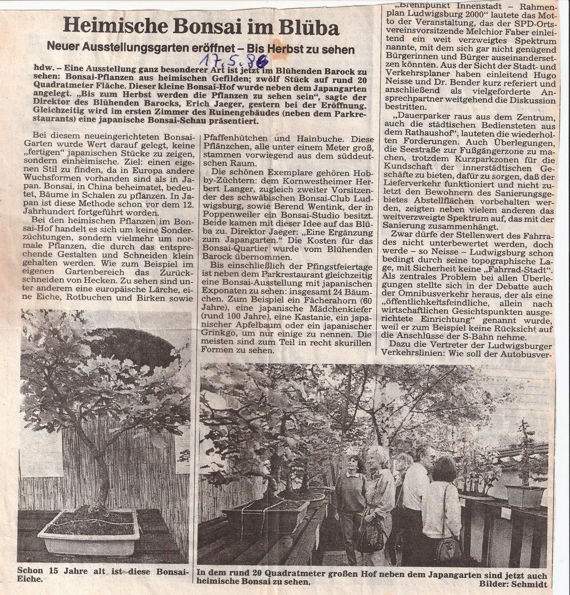 Angeregt durch persönliche Kontakte gelang es, die Leitung des Blühenden Barock für sich zu gewinnen und so kam es, dass bereits 1986 eine kleine Bonsaiecke auf dem Gartenschaugelände eröffnet wurde, auf der über die gesamte Saison einige Bonsai ausgestellt wurden.